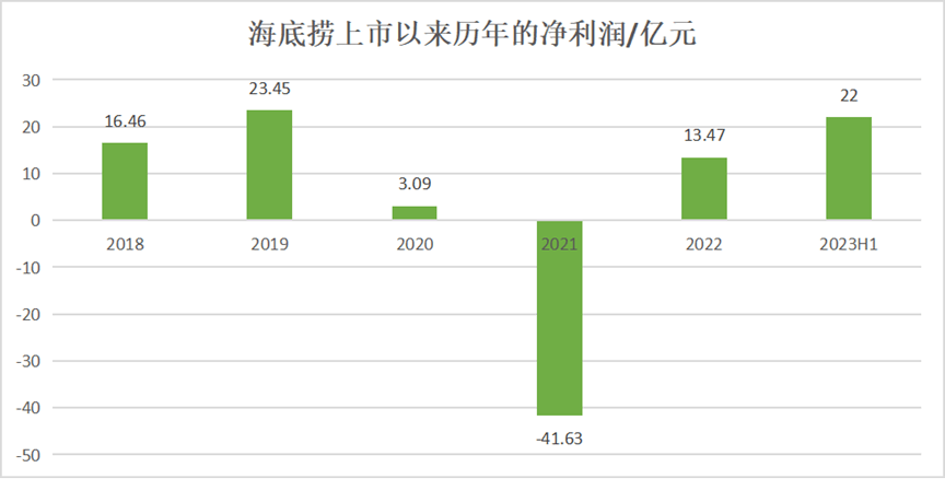回顾海底捞历年的年报数据,从2018年上市至2022年,其净利润分别为16.46亿元、23.45亿元、3.09亿元、-41.63亿元、13.74亿元。