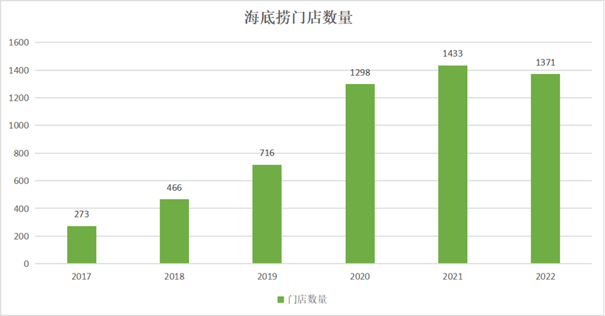 海底捞股价飙升的2020年和2021年,也是其门店数量增长最快的时期,从2019年的716家门店,增长至2021年关店之前的1597家。