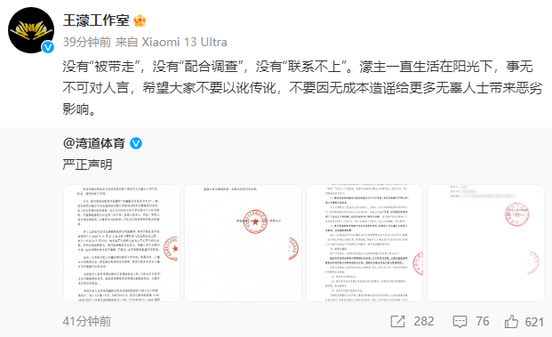 随后。王濛工作室也转发声明并表示王濛没有被带走配合调查,也没有联系不上。