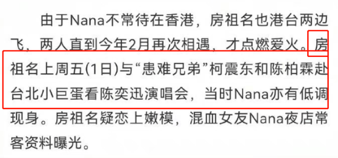 两人在一起后,房祖名还曾带着娜然跟好兄弟柯震东、陈柏霖等一起去看陈奕迅的演唱会,将娜然带进了自己的交友圈。