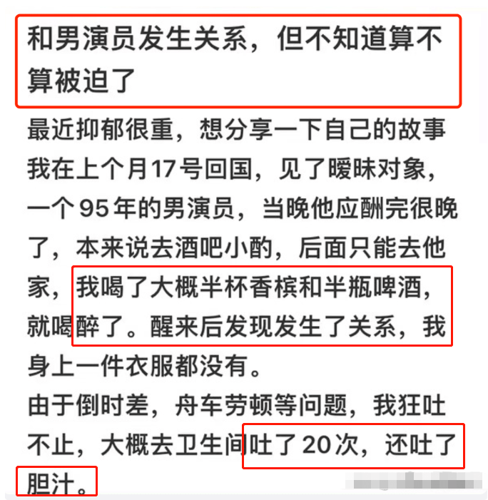 近日,有网友发文称自己与某男演员发生了关系,网友喝了半杯香槟和啤酒就醉了,醒来发现已经跟男演员发生了关系,酒后反应非常大,吐了20多次,不知道是不是被迫了。