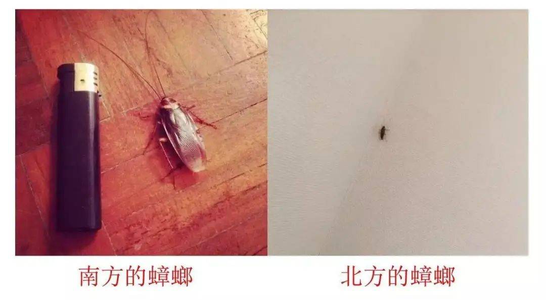 因气候、饮食习惯不同,我国南方和北方的蟑螂在体形、习性上有所不同。生活在北方的蟑螂主要是德国小蠊,体型小,成虫体长一般1厘米多,有短翅但不能飞;生活在南方的蟑螂主要是美洲大蠊和澳洲大蠊,体型相对较大,成虫体长一般3厘米以上,有翅膀且能短距离飞行。如果把北方的德国小蠊比作才孵出的小鸡,那南方的美洲大蠊和澳洲大蠊就是成年的母鸡。所以很多北方人初到南方,往往被又大又会飞的蟑螂吓一跳。