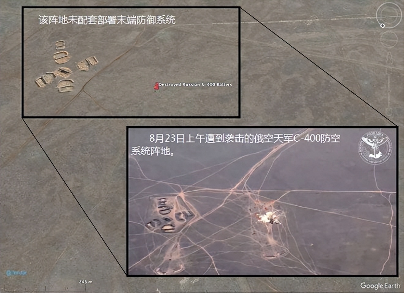 这样的事情不是第一次发生了。就在8月23日,当地时间上午10时,位于克里米亚半岛陆地最西端奥列诺夫卡(Оленовка)的一处俄军C-400地空导弹阵地,遭到了乌军P-360“海王星”反舰导弹的袭击,配套的1部48Я6 Подлет-К1低空补盲雷达和1辆5П85СМ2-01发射车受彻底损毁。而且,整个过程还被无人机全程跟拍了下来。