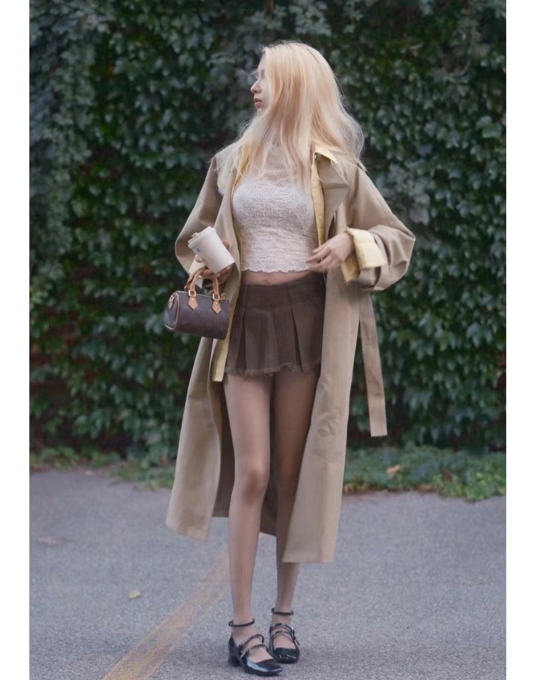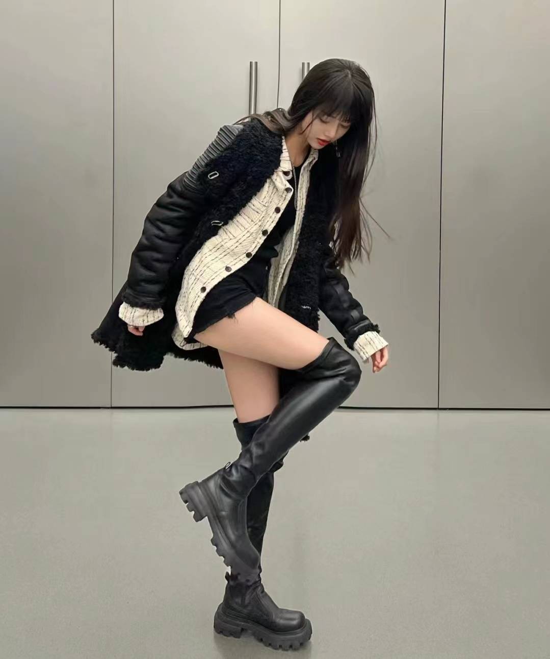 1:选择线条感极强的长外套,下半身适当的露肤,不仅拉长身型,还能够起到修饰腰粗胯宽的作用。
