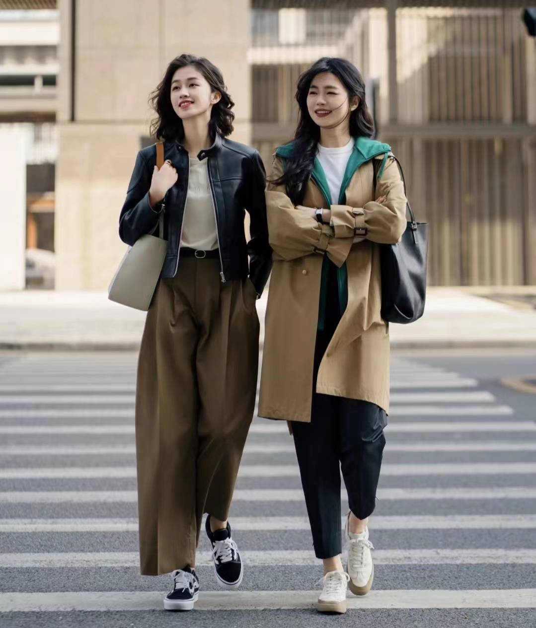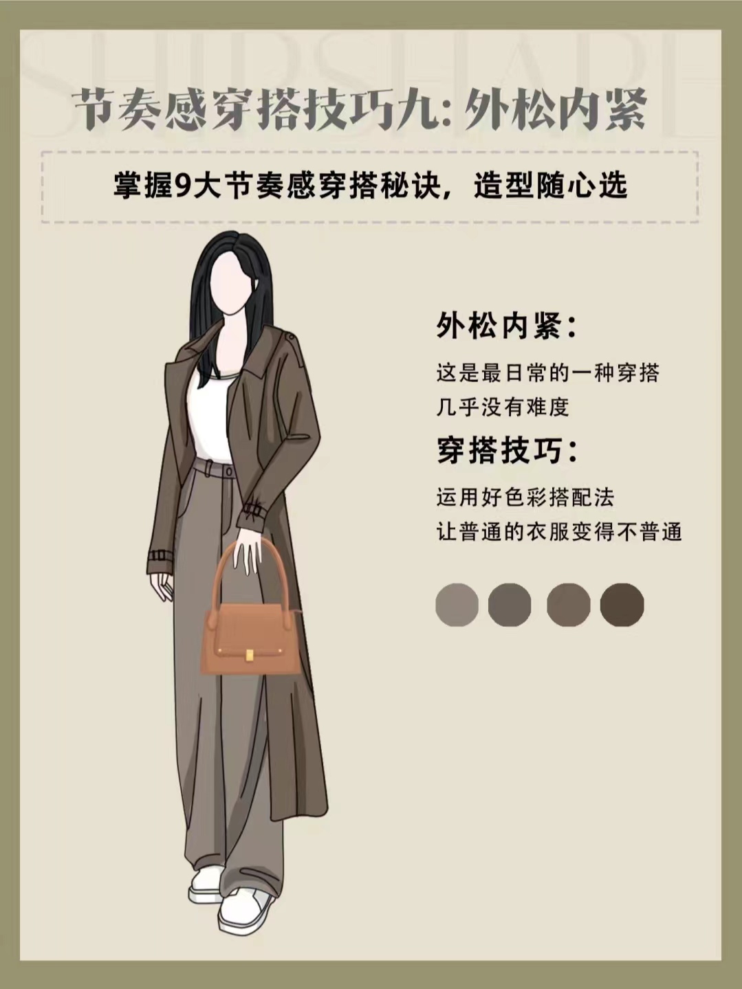 外紧内松的穿搭公式时尚且舒适:可以选择贴身的上衣或外套,突出身材线条,而在下身选择宽松的裤子或裙子,增加舒适感。