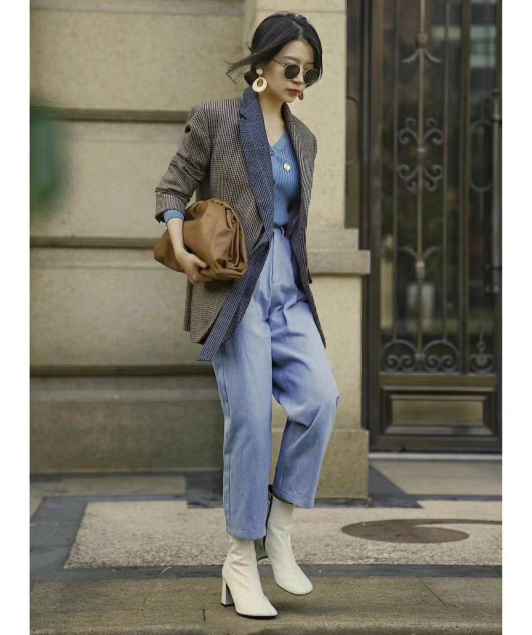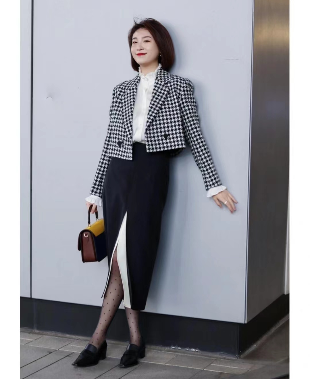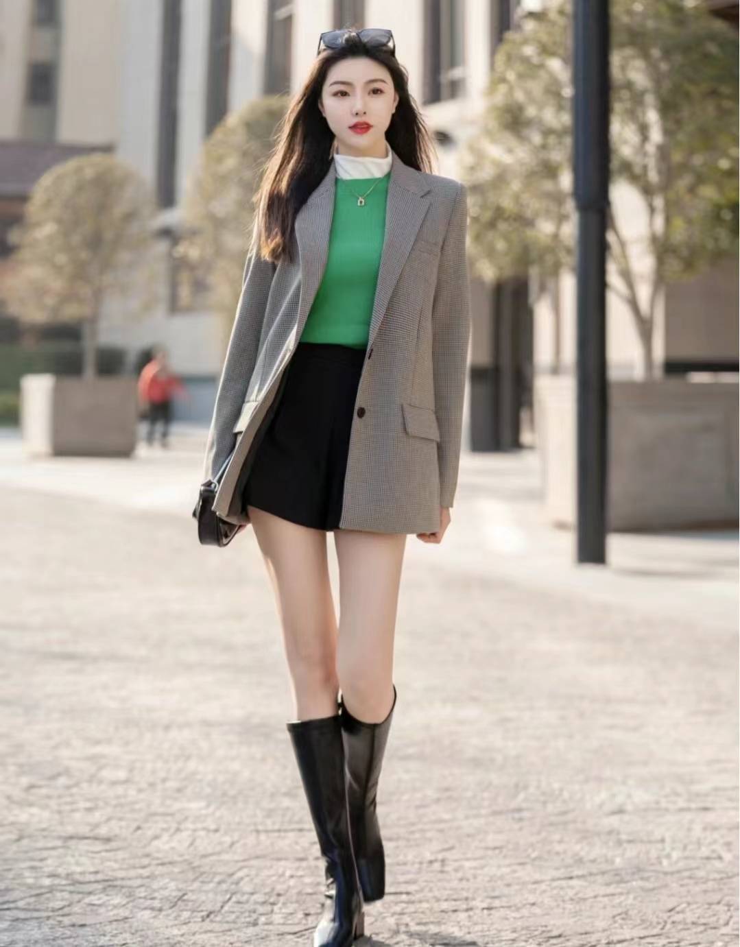 外套的长度决定了腰线的视觉高低,外套越短,腰线越高,就越显高。可以营造出高腰线,拉长腿部线条,显瘦又显高。