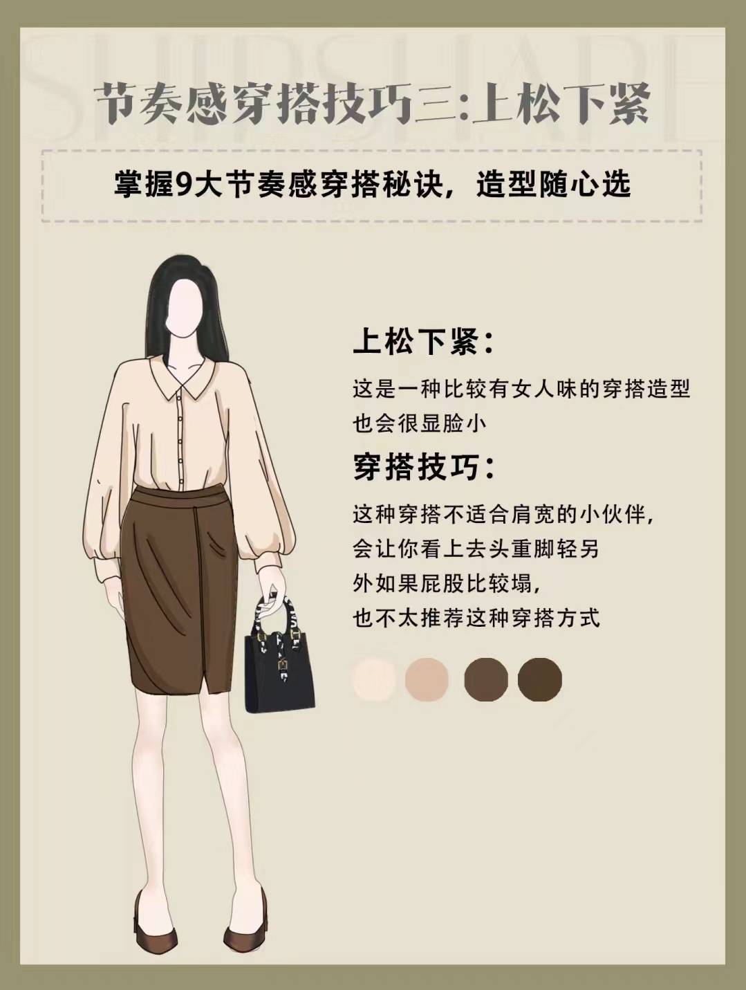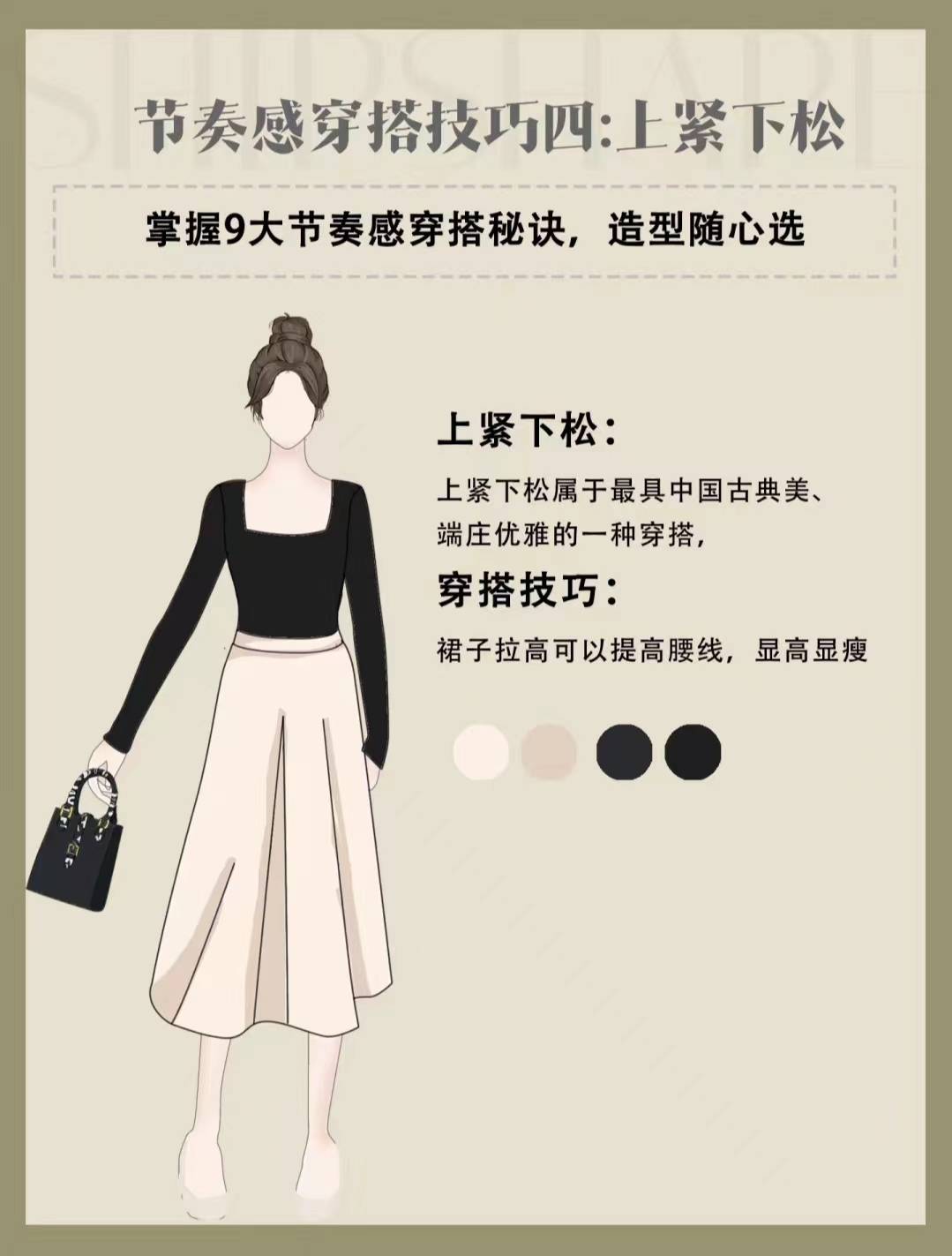 上紧下松的穿搭方式可以突出身材曲线,增加时尚感。对于上半身曲线优美的人来说,可以选择露腹设计的紧身上衣,以展现出腰部的曲线;而对于腰部没有曲线感的人来说,可以选择不露腹的紧身上衣,搭配宽松的下装来打造腰窄臀宽的曲线。