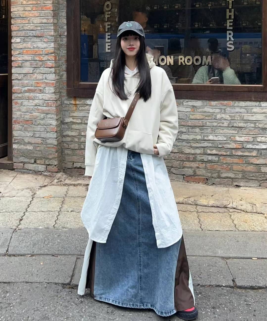 这种穿搭会让你显得更轻盈,也更高挑,减短内搭,会让整体穿搭更具节奏感。