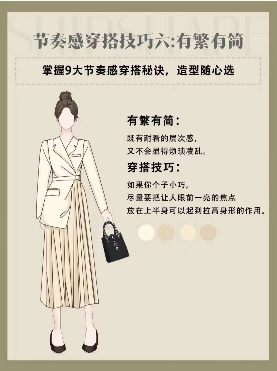 下装应选择简洁款式,如纯色的裤子和裙子,与上衣的复杂设计形成对比,让整体造型更加有层次感;内搭也选择一些简约款式的单品,与外套的复杂设计形成对比,让整体造型更加有层次感。