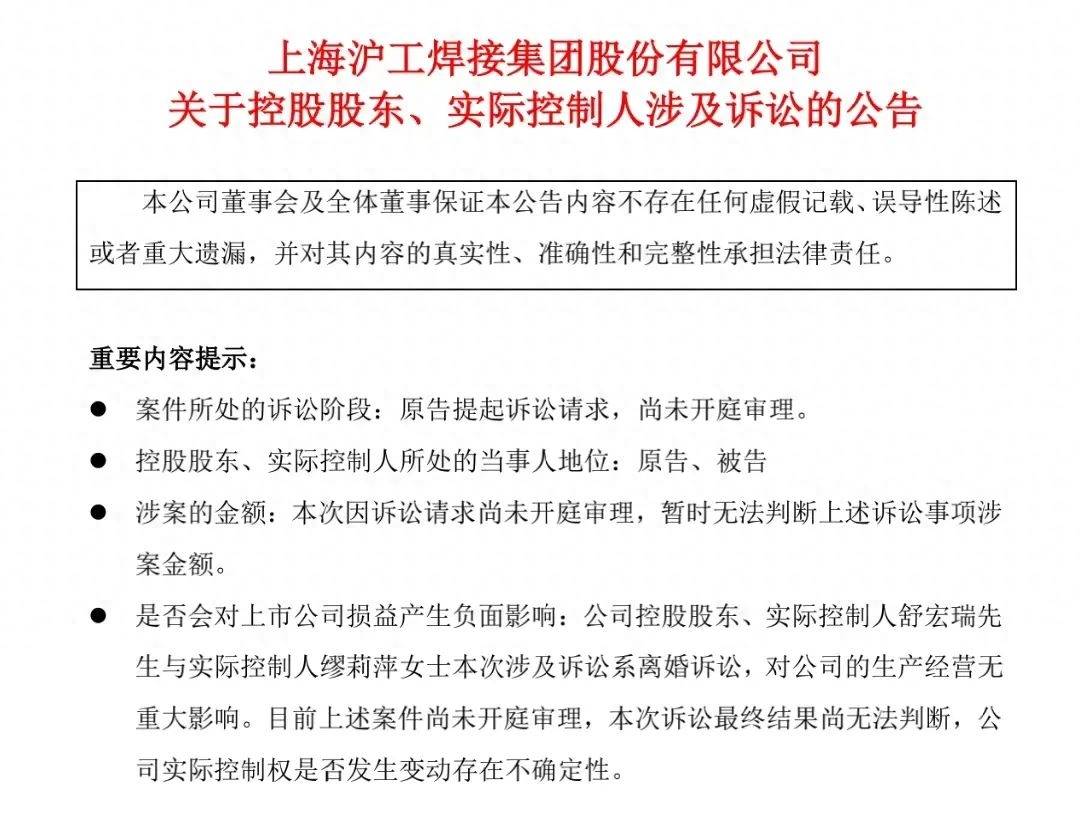 上海沪工表示,本次实控人舒宏瑞、缪莉萍涉及诉讼系离婚诉讼,对公司的生产经营无重大影响。但是,由于目前上述案件尚未开庭审理,诉讼最终结果无法判断,所以公司实际控制权是否会发生变动存在不确定性。