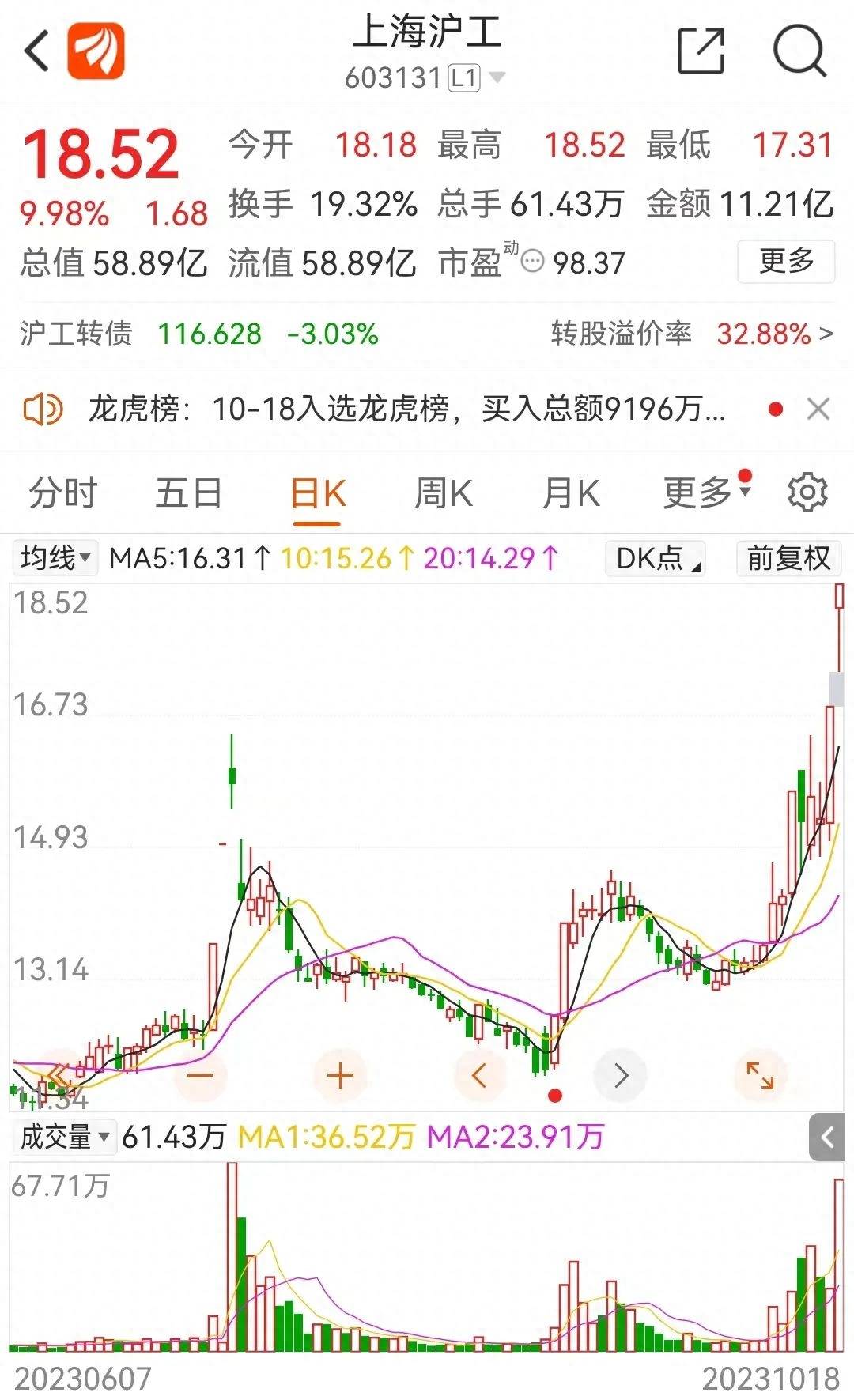 据悉,上海沪工是近期的大牛股,从11.81元的股价低点涨到了18.52元/股,市值近60亿。近两个交易日连续涨停。
