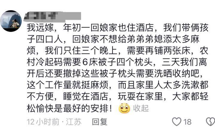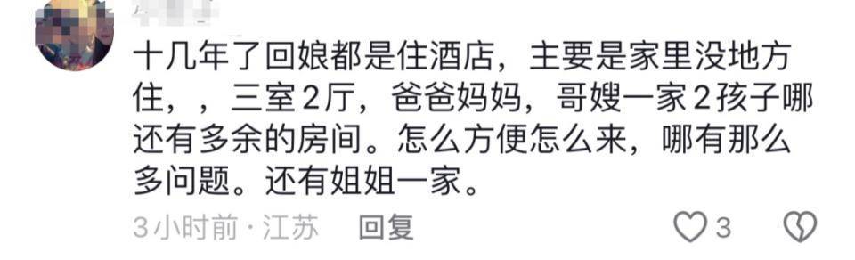 有网友表示自己回娘家,一家四口人太多,不想给家里人添麻烦,所以主动选择住酒店。