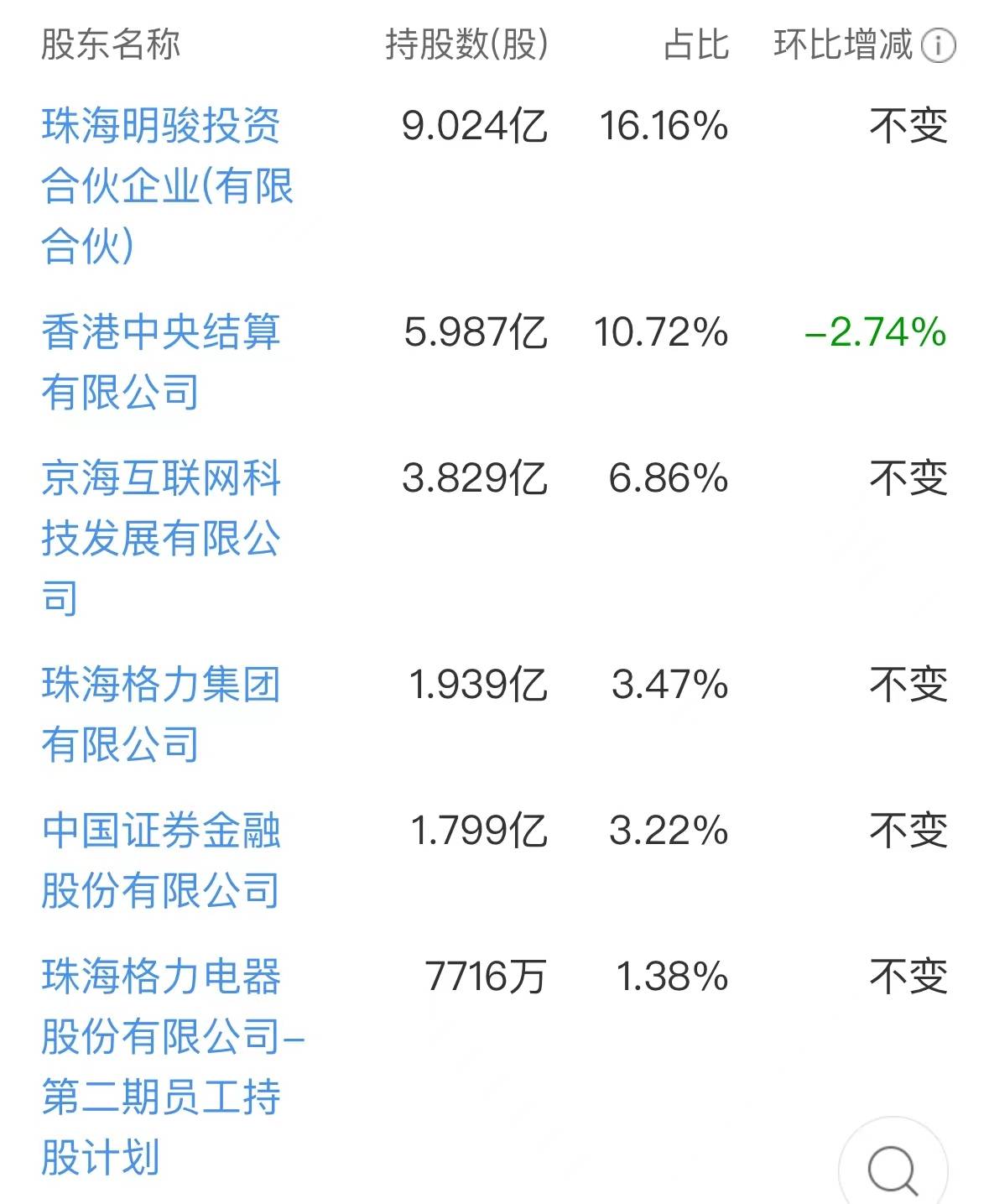截至2023年10月30日,格力集团持有格力电器股权为3.47%,是上市公司的第四大股东。公司目前第一大股东是珠海明骏投资合伙企业(有限合伙),持股比例为16.16%,第二大股东为香港中央结算有限公司,持股比例为10.72%,第三大股东为京海互联网科技发展有限公司,持股比例为6.86%。