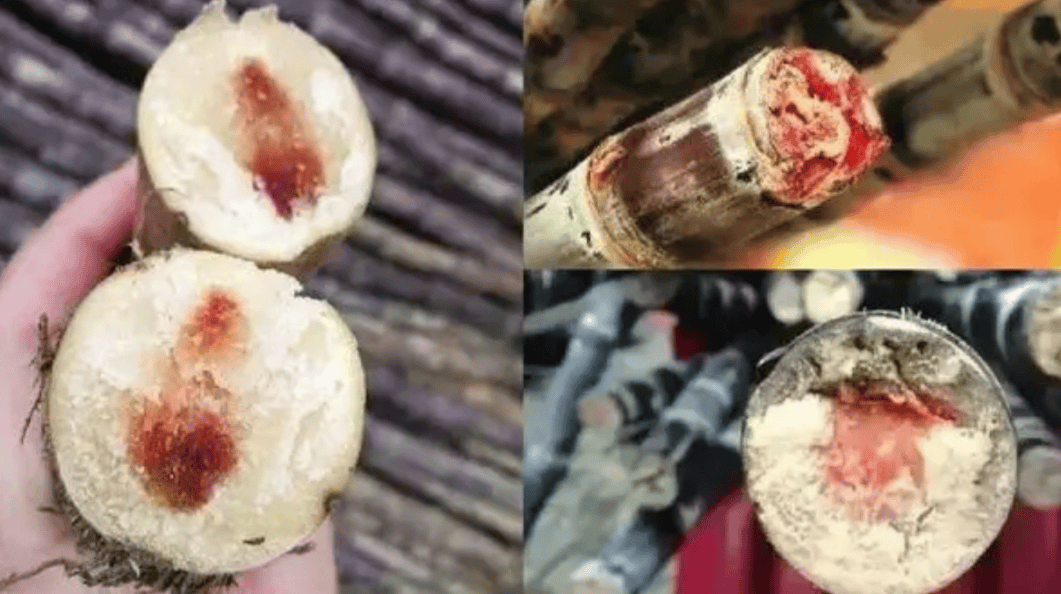 ◆切开后瓤部的色泽比正常甘蔗深,一般呈浅棕色,蔗芯发红或发灰,甚至有时还能看到毛茸茸的菌丝;