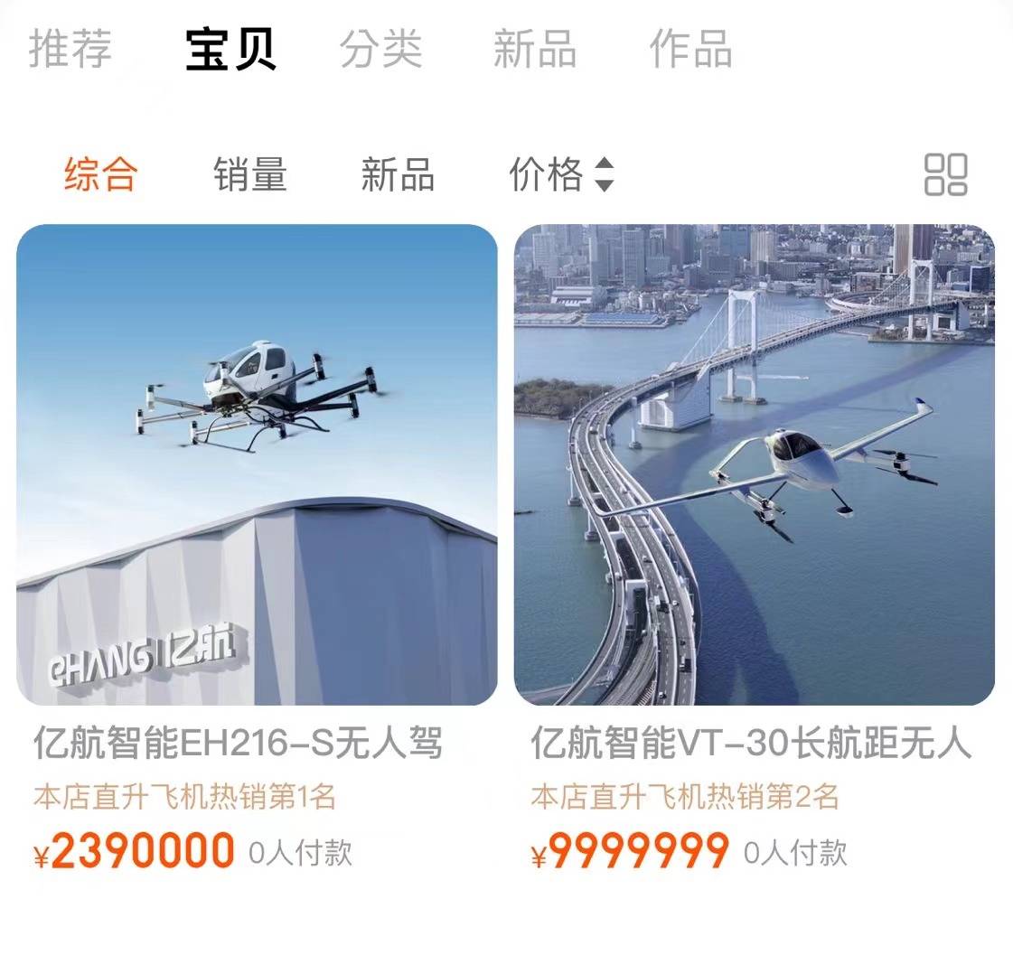 新京报贝壳财经记者查询亿航智能淘宝店铺发现,EH216-S在亿航智能的淘宝平台零售价239万元,其已售数据为0。