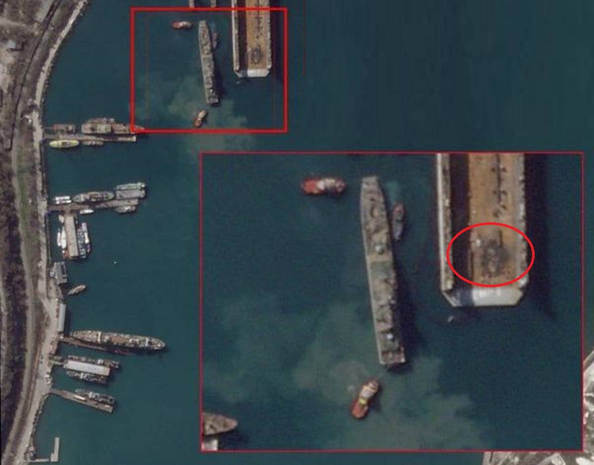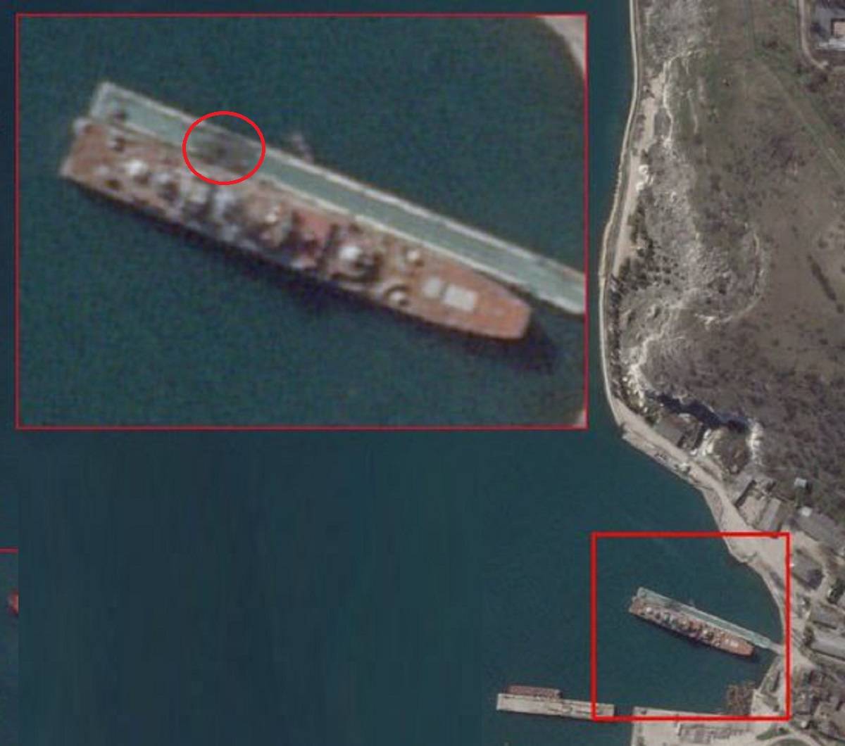 卫星图片上显示,遭受袭击时其中一艘正停泊在码头上。该舰自身并没有可见的受损迹象,像是导弹的落点是在旁边码头路面上。黑色的爆炸痕迹和中间的弹坑清晰可见,虽然落点距离登陆舰很近,但可以确定没有直接命中。或者会有爆炸产生的碎石或弹片击中了舰体,可应该不会造成太大损失。