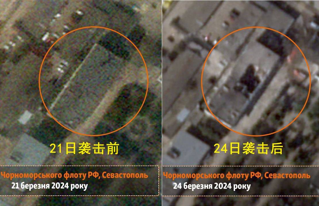 但从网上之后流传出来的卫星图看,乌军消息的准确度是一半一半:在对比之前的卫星图片可以看出,这个通讯中心所在的建筑物的确在屋顶出现了一个明显的大洞。俄军这个被摧毁的通讯中心所在地,其实是黑海舰队的数据处理中心。这里遭受打击后,或许将会影响俄军在之后行动中的通讯和数据处理能力。
