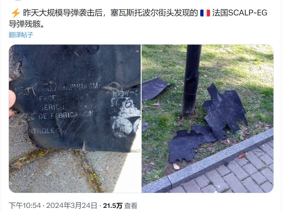 如果这个洞是由巡航导弹造成的,那么可以确认导弹装备的是钻地战斗部,楼内的设备和人员大概率已被彻底摧毁。而从第二天当地居民在街头发现的导弹残骸可以证实,23日夜间乌军可能使用了法国提供的SCALP-EG巡航导弹对这个通讯中心发起了打击。此外,乌军还宣称击中了2艘黑海舰队的大型登陆舰,但并没有公布是用导弹还是无人机发起的攻击。