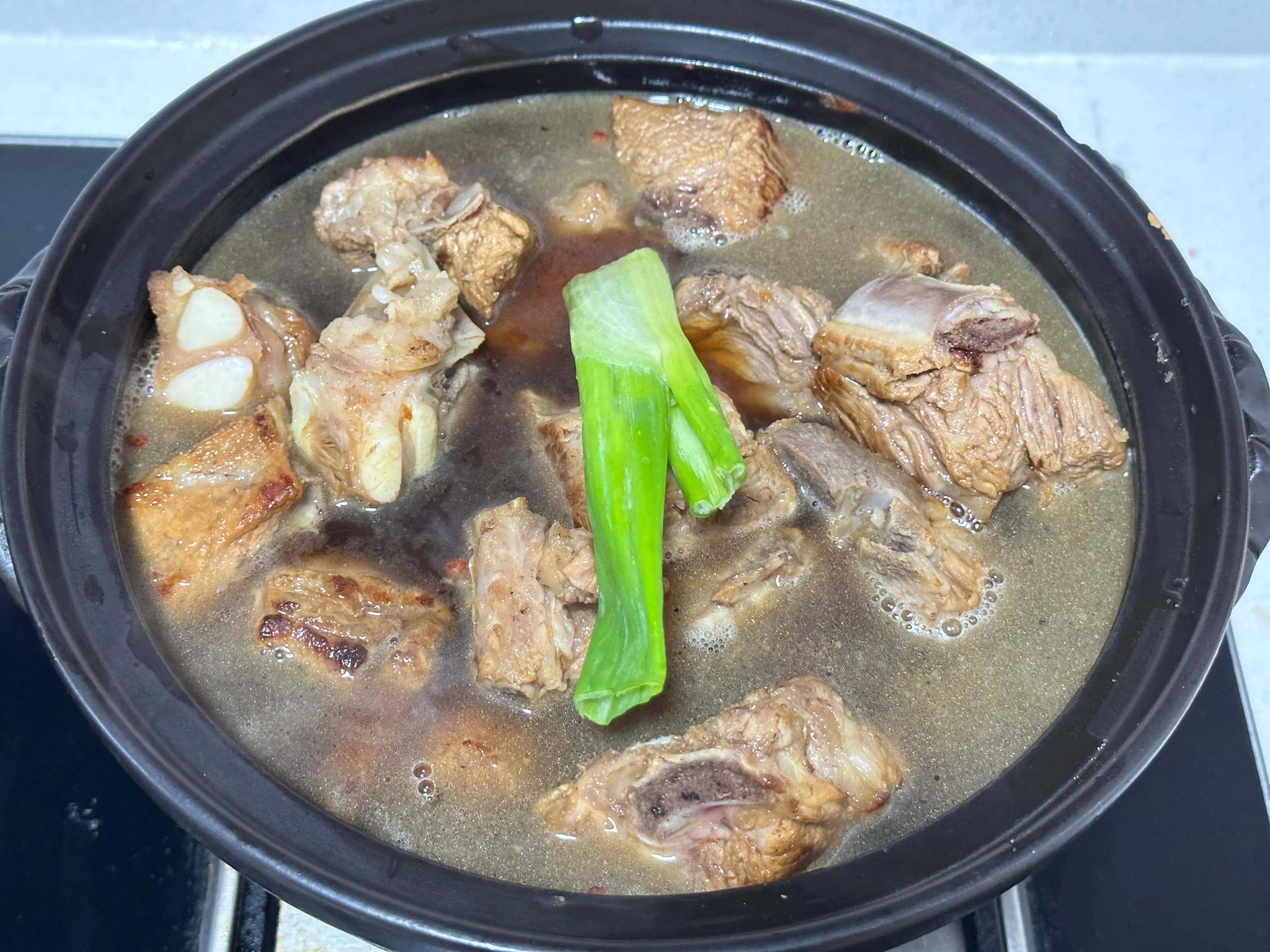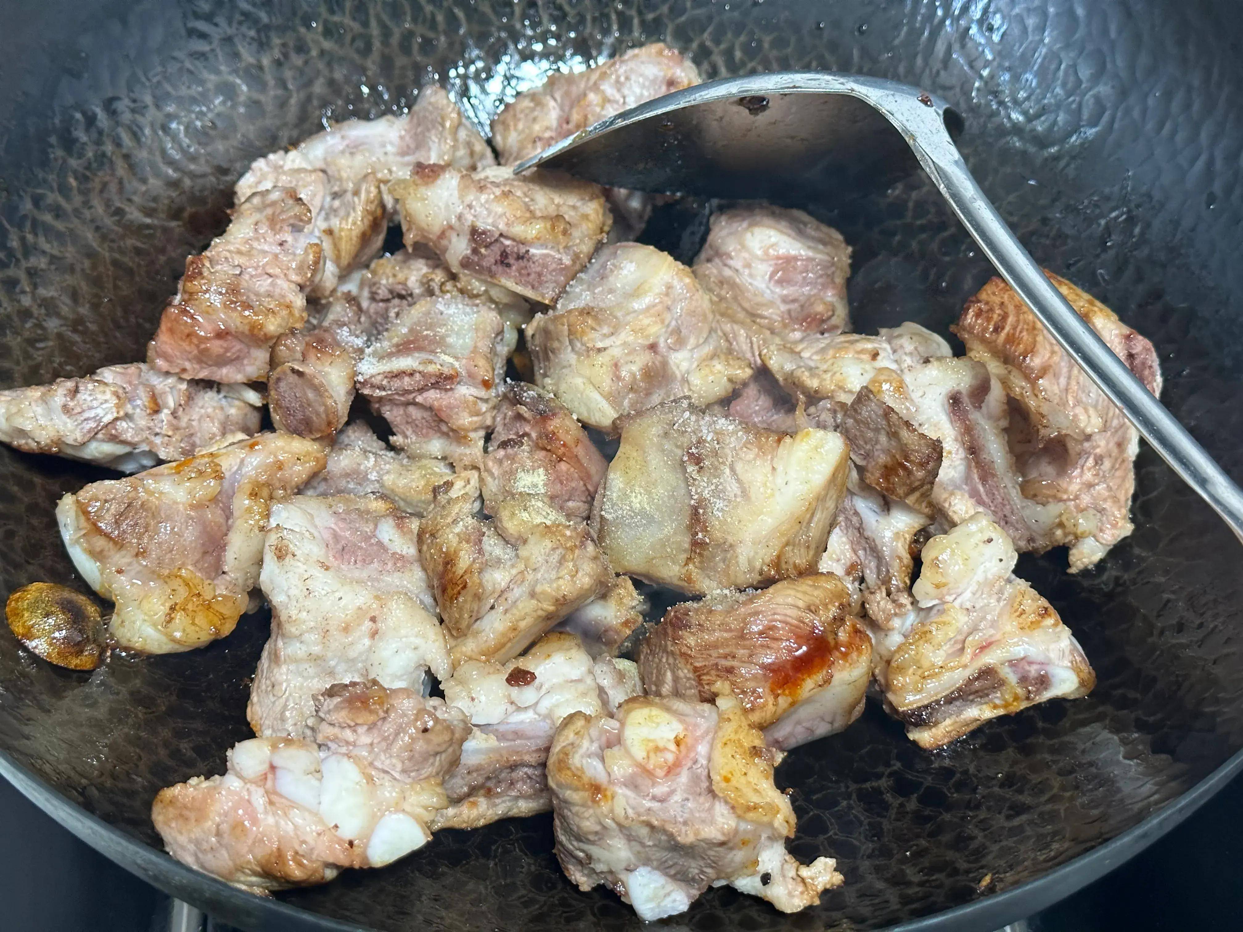 4、加入生抽1勺 老抽2勺 盐1勺 胡椒粉2克 姜粉2克 花椒八角适量,翻炒至上色,加入没过食材的排骨;转移到砂锅里;最后加入葱段;