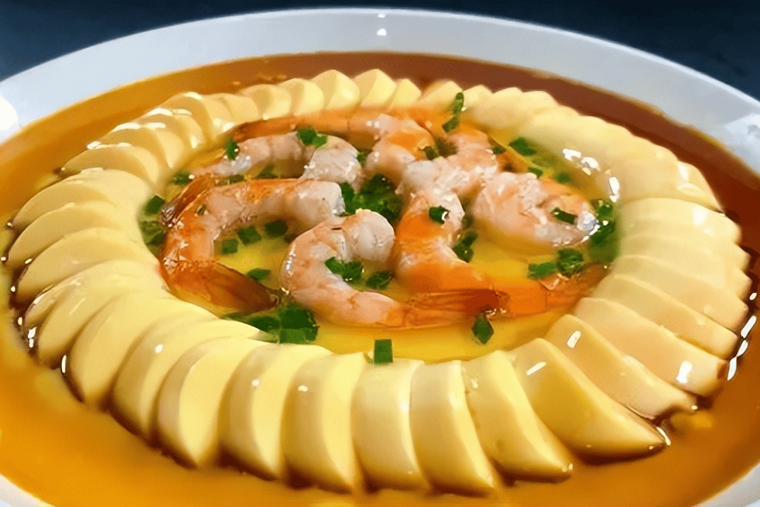 5、五分钟后,打开锅盖,把腌制好的虾仁逐个摆放在豆腐和蛋液上。然后,再盖好锅盖,使小火蒸约三分钟,把虾仁蒸熟透。