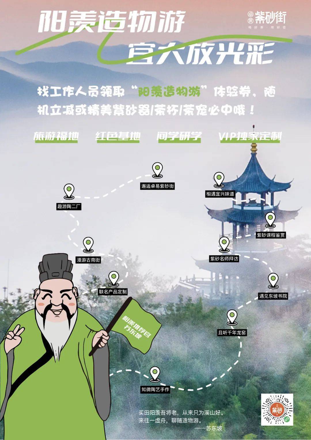 “买田阳羡吾将老,从来只为溪山好。来往一虚舟,聊随造物游。”苏东坡在宜兴(古称阳羡)留下了千古名句。阳羡造物游作为卓易文化推出的特色文旅项目,是一场沉浸于宜兴紫砂文化的深度体验之旅。针对学子、旅游家等用户群体推出“阳羡造物游问学篇”和“陶阳羡造物游如归篇”等活动,当然,也可根据您的喜好进行VIP定制!在这里,您将亲手触摸到紫砂的温润,感受到陶火的温度,领略到传统与现代的完美融合。通过参观前墅龙窑,您可以深入了解非遗龙窑的魅力和历史。此外,我们还提供专业的紫砂课程,让您在名师的指导下,学习紫砂壶的品鉴之道,领悟茶艺社交的精髓。在澄澈的湖水、连绵的竹海、密布的茶田中,感受到自然的宁静与和谐,找到内心的舒适与宁静。