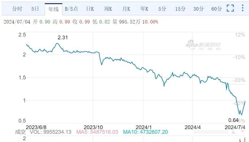 紧接着的6月21日、24日、25日的三个交易日,公司股价连续跌停。6月26日,广汇汽车股价涨停,收报0.78元/股,27日又大跌8.97%,到28日,再度下跌;7月1日、2日、3日和4日,广汇汽车股价实现连续涨停。但截至7月4日收盘,该股报价0.99元/股,依旧在1元以下。